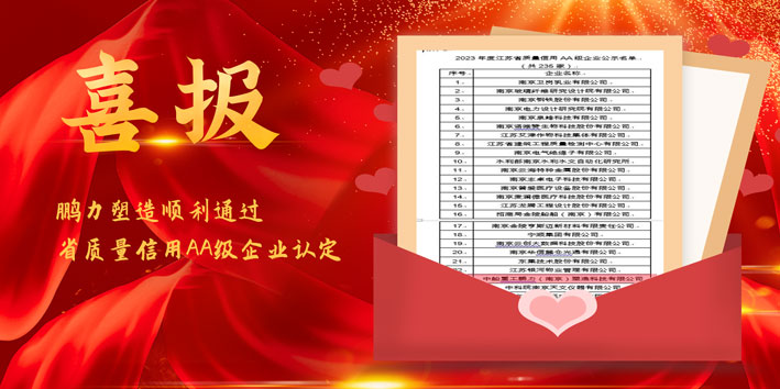 近日,江苏省市场监督管理局公布了2023年度江苏省质量信用AA级企业名单。鹏力塑造凭借优异的质量管理水平和诚信的经营理念,成功通过认定。【2023-12-16】